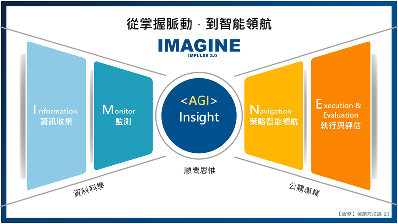 隨著生成式AI(AGI)技術的日益成熟,公關工作中對時間、創意和效率的要求愈加嚴苛,唯有與技術並肩前行,才能在水深火熱的市場中常保領先地位。因此,布爾喬亞決定全面升級其服務模式,進一步達成服務科技化的願景,將『I.M.P.U.L.S.E. 策略優先公關方法論』結合AGI技術,全面升級2.0版本-『I.M.AGI.N.E.』 。