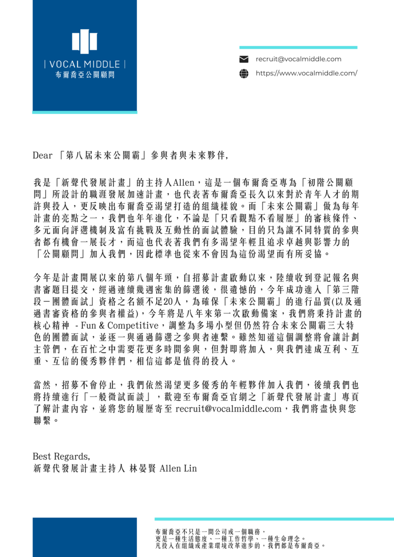 接下來,布爾喬亞已經著手安排不同場次的小組面談,並預計於7月或10月報到,不論是希望應聘正職的應屆畢業生、三年以下經驗工作者,或是渴望以在學身份搶先體驗布爾喬亞職涯的,我們都誠摯歡迎!只要將你的履歷寄至 recruit@vocalmiddle.com ,我們將盡快與你聯繫。