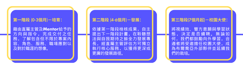 而「約聘公關顧問」是正職培養與觀察的前哨站。 布爾喬亞以多年聘用、養成經驗為基礎、培養正職夥伴為目標,打造為期3-6個月的完整養成計畫,並以每三個月為一個成長與檢核階段,在富有高度尊重、器重與自主發展空間的前提之下,養成一批批商業視野、基礎能力、實戰經驗皆遠優於同齡人的新聲代工作者。