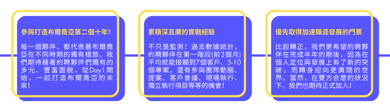 布爾喬亞的「約聘」夥伴:體驗的不是職場,而是未來職涯與個人發展的速度感;認識的不是公關,而是商業問題與公關手段的最佳解;任職的不是菜鳥,而是值得信賴又獨當一面的好戰友。