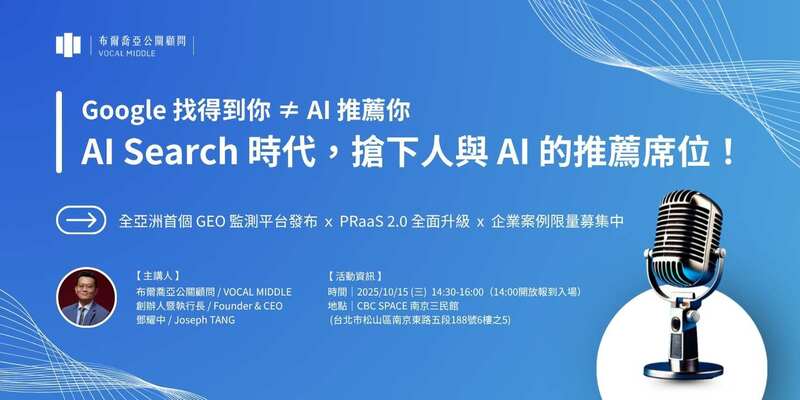 👉 了解更多:10/15 (三) 全亞洲首個 GEO AI 原生產品上市!AI Search 時代,搶下人與 AI 的推薦席位!