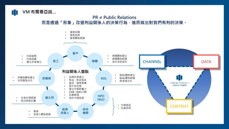 接下來就要回歸到 VM 的服務體系,自從 2022 年正式建立起 「PRaaS-PR as A Solution|一站式公關顧問解決方案平台」體系,為企業客戶提供策略優先、溝通為衷、平台鏈結的一站式服務,讓企業客戶能通過 VM 享有資料科學釐清源頭、顧問思惟提供最佳建議與公關專業落地執行的完整服務。(概念同 VM 於 2017 年推出的 IMPULSE 策略優先公關方法論)