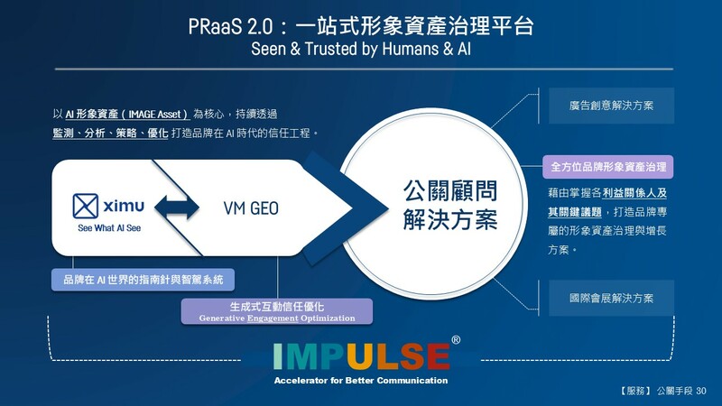 2025 年,隨著 AI 搜尋引擎改變傳統傳播生態,PRaaS 也在 AI 賦能下正式升級為「PRaaS 2.0 -PR as AI Solution|一站式形象資產治理平台」,以公關顧問服務為核心,延伸打造 GEO AI 原生系統 ximu 與 VM GEO 服務,為企業客戶建立、維護、累積在 AI 世界的形象資產;同時鏈結關鍵資源,部屬廣告創意與國際會展兩大解決方案。讓企業客戶在任何需求下,都能透過 PRaaS 2.0 獲得相應的解決方案。