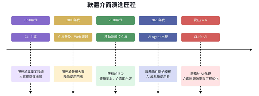 於是,CLI 的回歸成為必然。這不是技術的倒退,而是服務物件改變後的必然選擇。當軟體的第一使用者從「人」變成「AI」,介面的設計哲學必須徹底重寫。